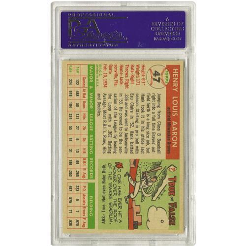 <B>1955 Topps Hank Aaron #47 PSA Mint 9.</B></I> An important second-year card for the man who would be King. In every regard, this one looks just as it did when it was removed from a wax pack over a half-century ago. Tremendous gloss, the sharpest of corners. Even the centering is great. Less than one percent of the total submissions of this card to PSA have rated Mint 9, and none have ever graded higher.