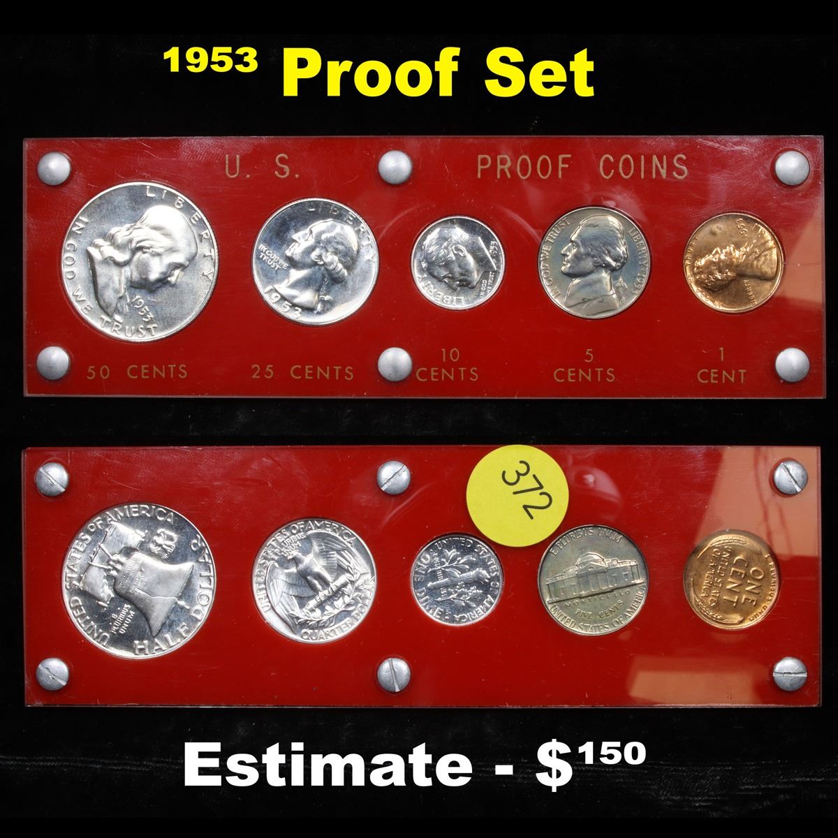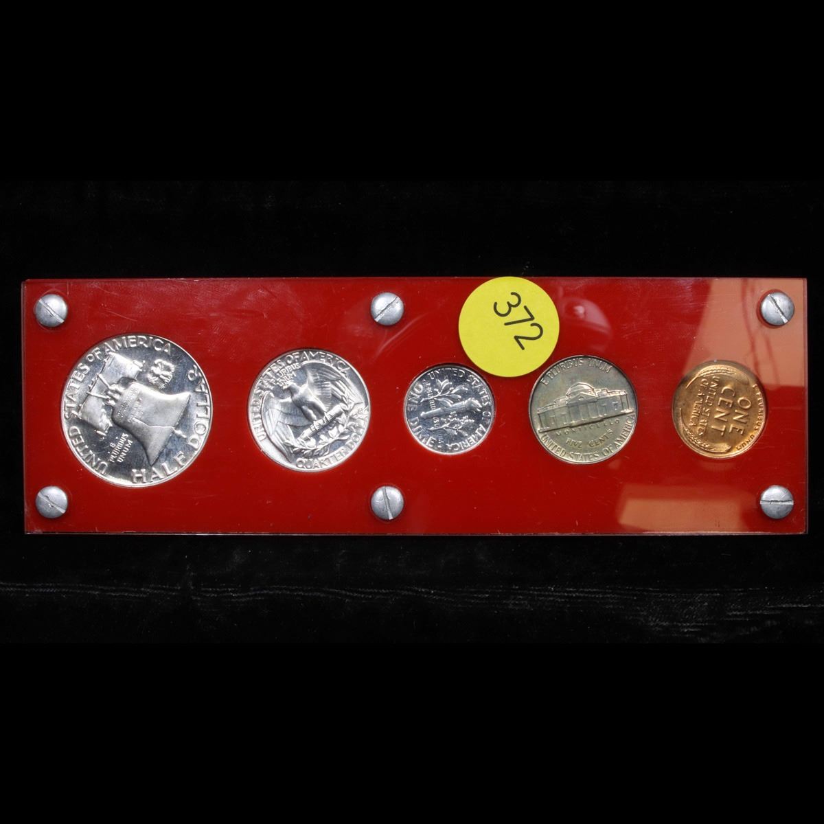 1955 United States Proof Set in Capital Plastic Holder.        This set, has a 90% Proof Silver Franklin Half Dollar, a 90% Proof Silver Quarter, a 90% Proof Silver Dime, plus the proof nickel and proof penny. All encased in a Capital Plastic Holder.