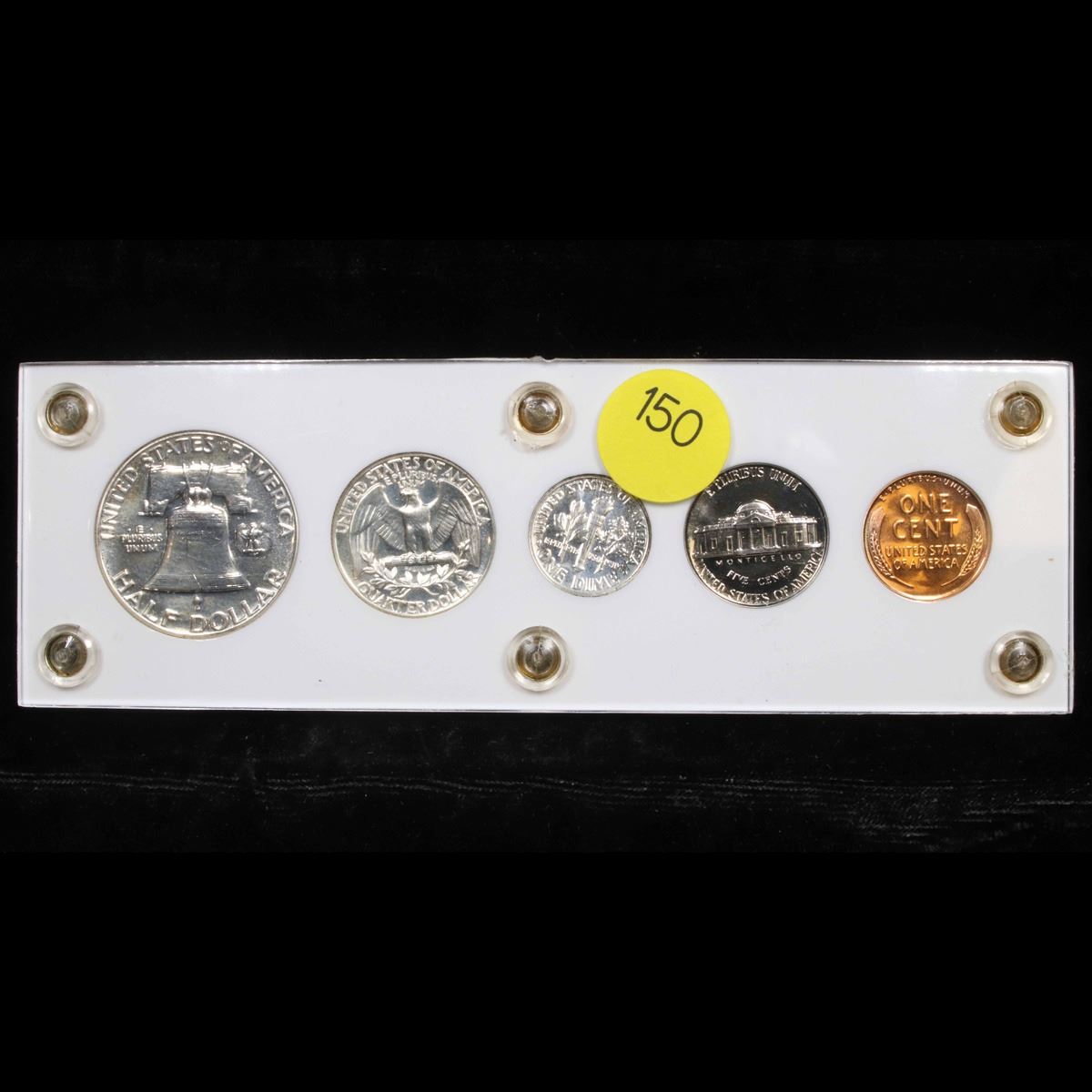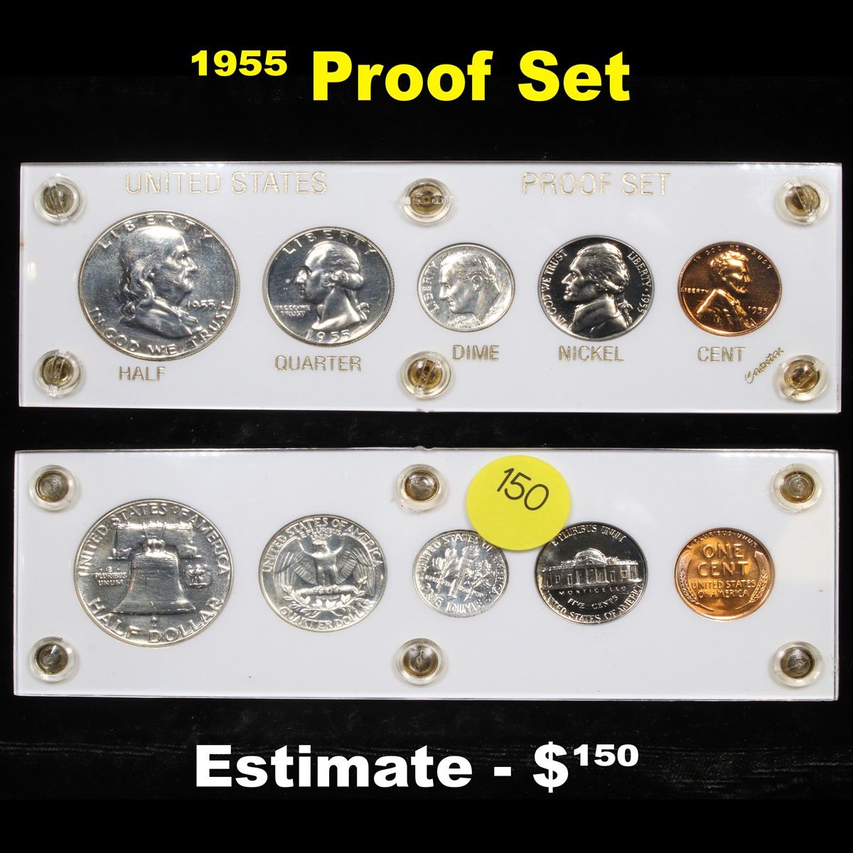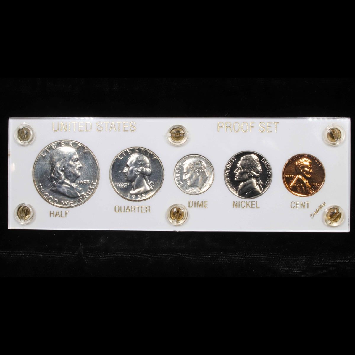 1955 United States Proof Set in Whitman Plastic Holder. This set, has a 90% Proof Silver Franklin Half Dollar, a 90% Proof Silver Quarter, a 90% Proof Silver Dime, plus the proof nickel and proof penny. All encased in a Whitman Plastic Holder.