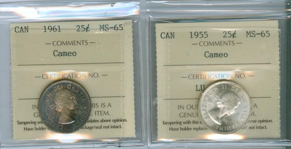 1955 and 1961. Lot of 2 ICCS graded 25¢ coins, both MS65 CAMEO.