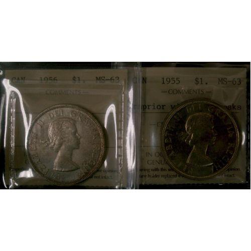 1955 arnp w/die and 1956 $1. Lot of 2 coins both ICCS MS63.