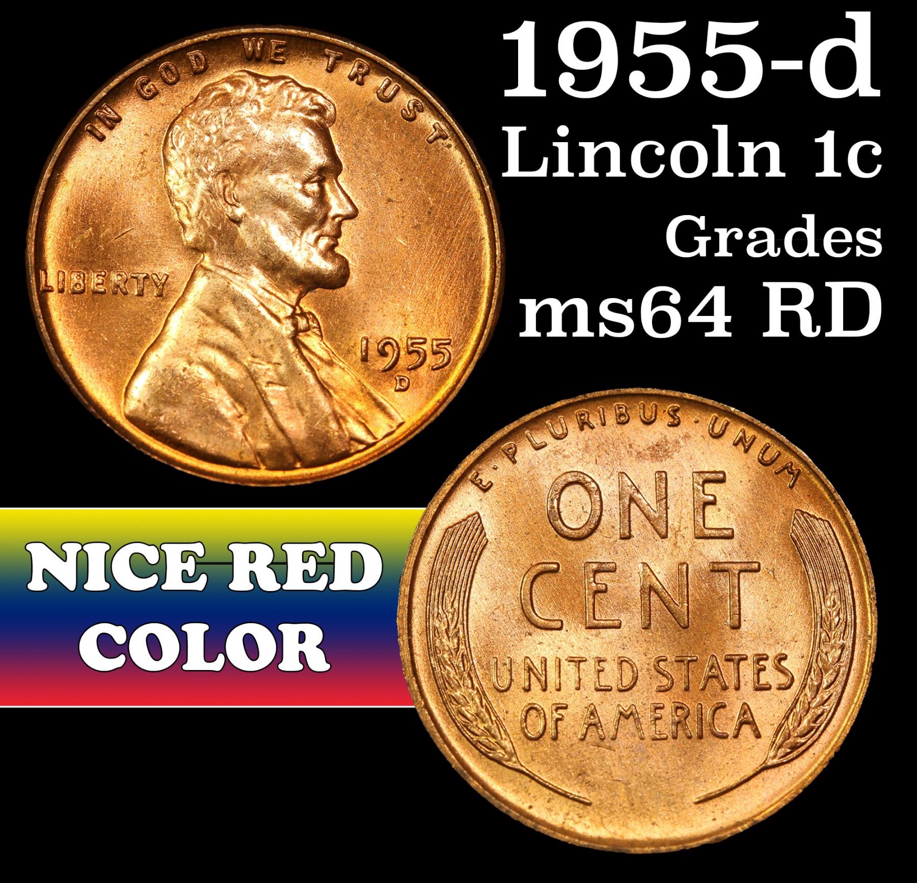 1955-d Lincoln Cent 1c Grades Choice Unc RD.