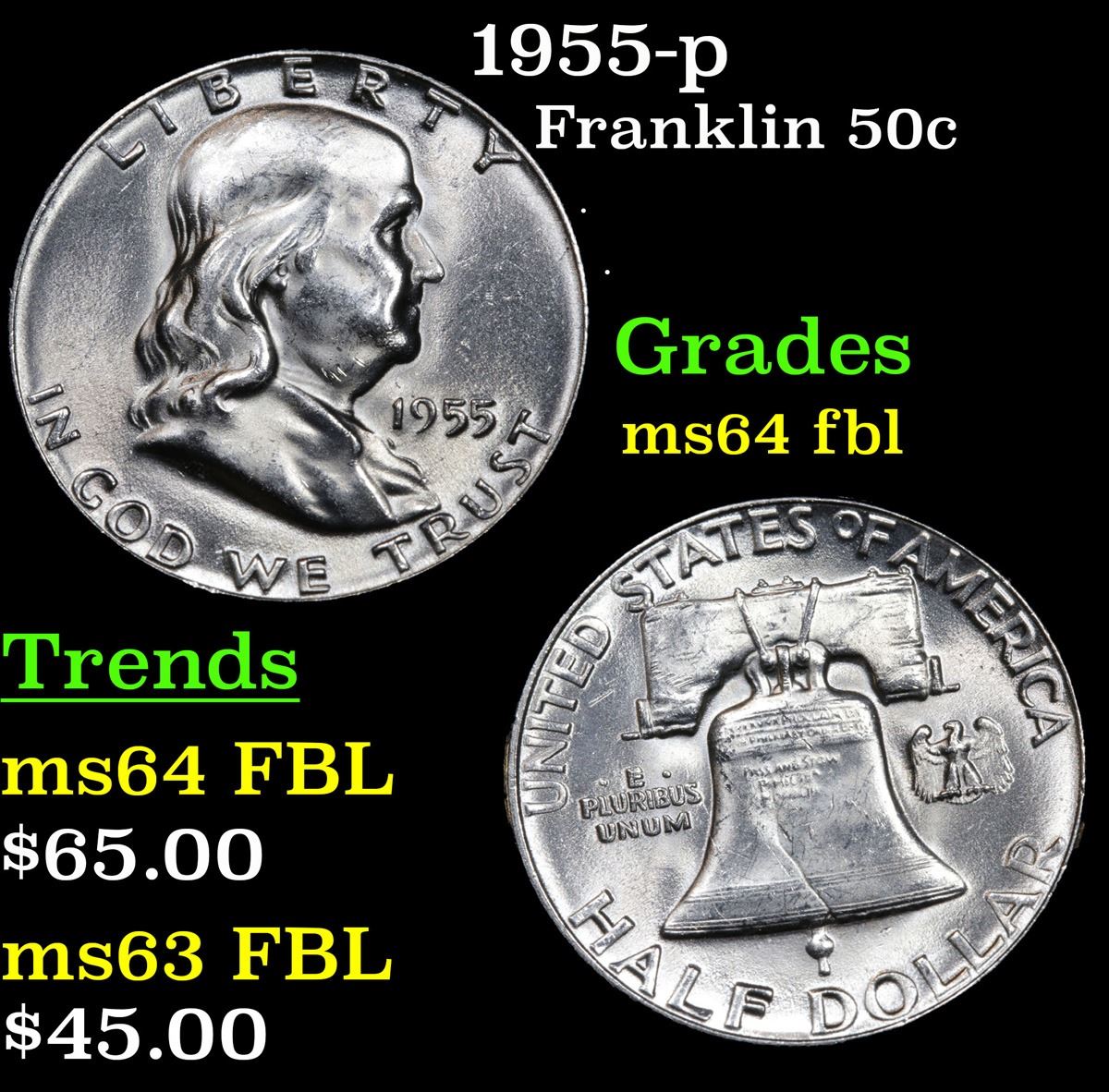 1955-p . . Franklin Half Dollar 50c Grades Choice Unc FBL.