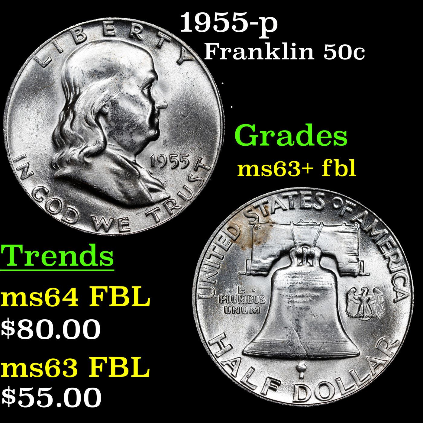 1955-p Franklin 50c Grades Select Unc+ FBL