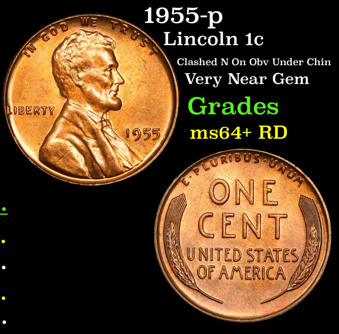 1955-p Clashed N On Obv Under Chin Very Near Gem Lincoln Cent 1c Grades Choice+ Unc RD.