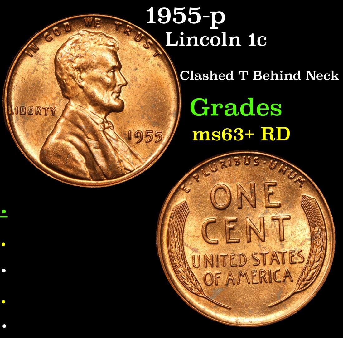 1955-p Clashed T Behind Neck . Lincoln Cent 1c Grades Select+ Unc RD.