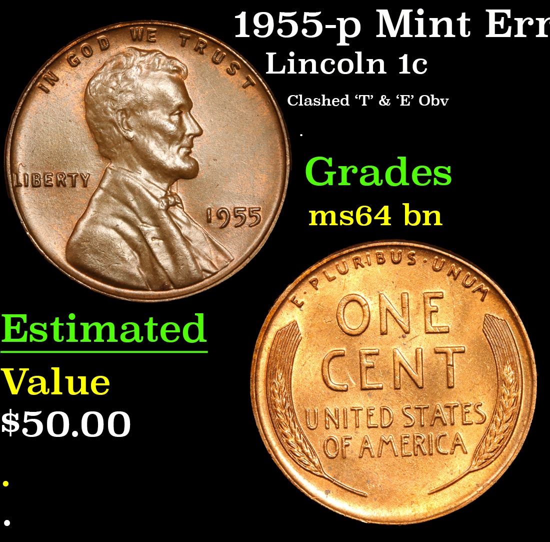 1955-p Mint Error Clashed 'T' & 'E' Obv . Lincoln Cent 1c Grades Choice Unc BN. A Corey's Pick, Bid to Win Coin