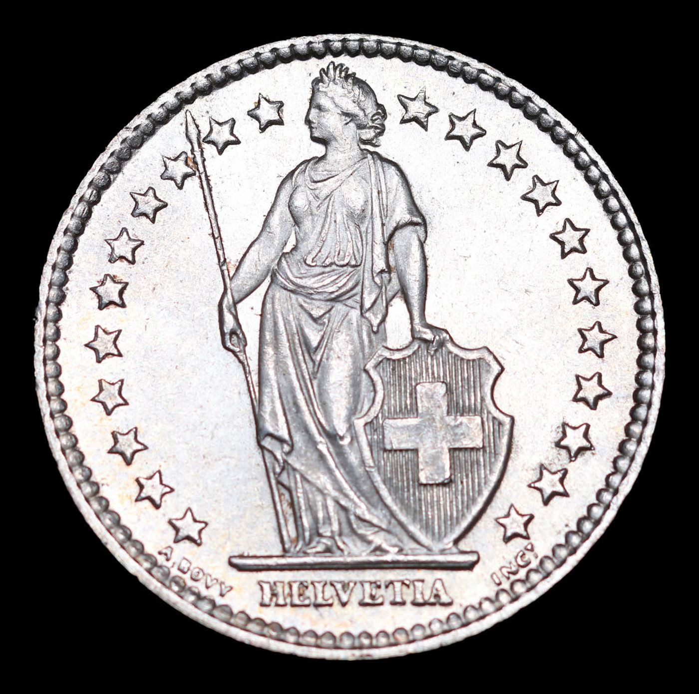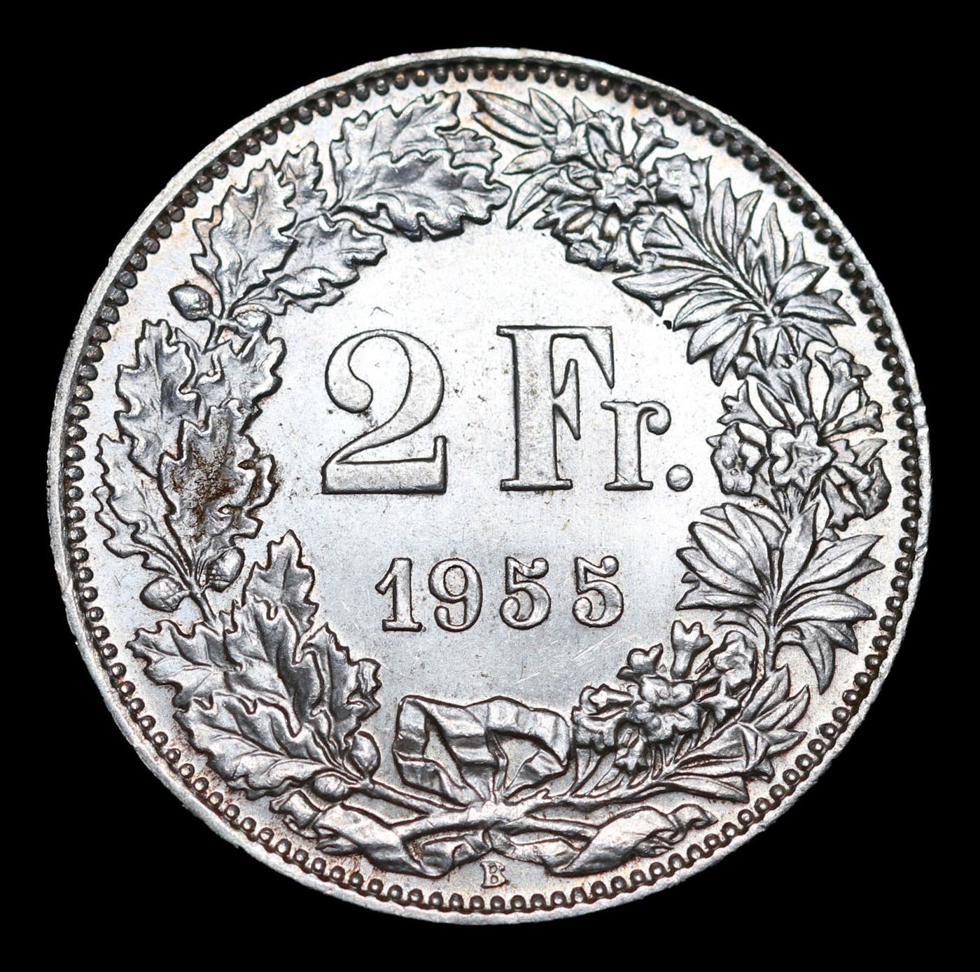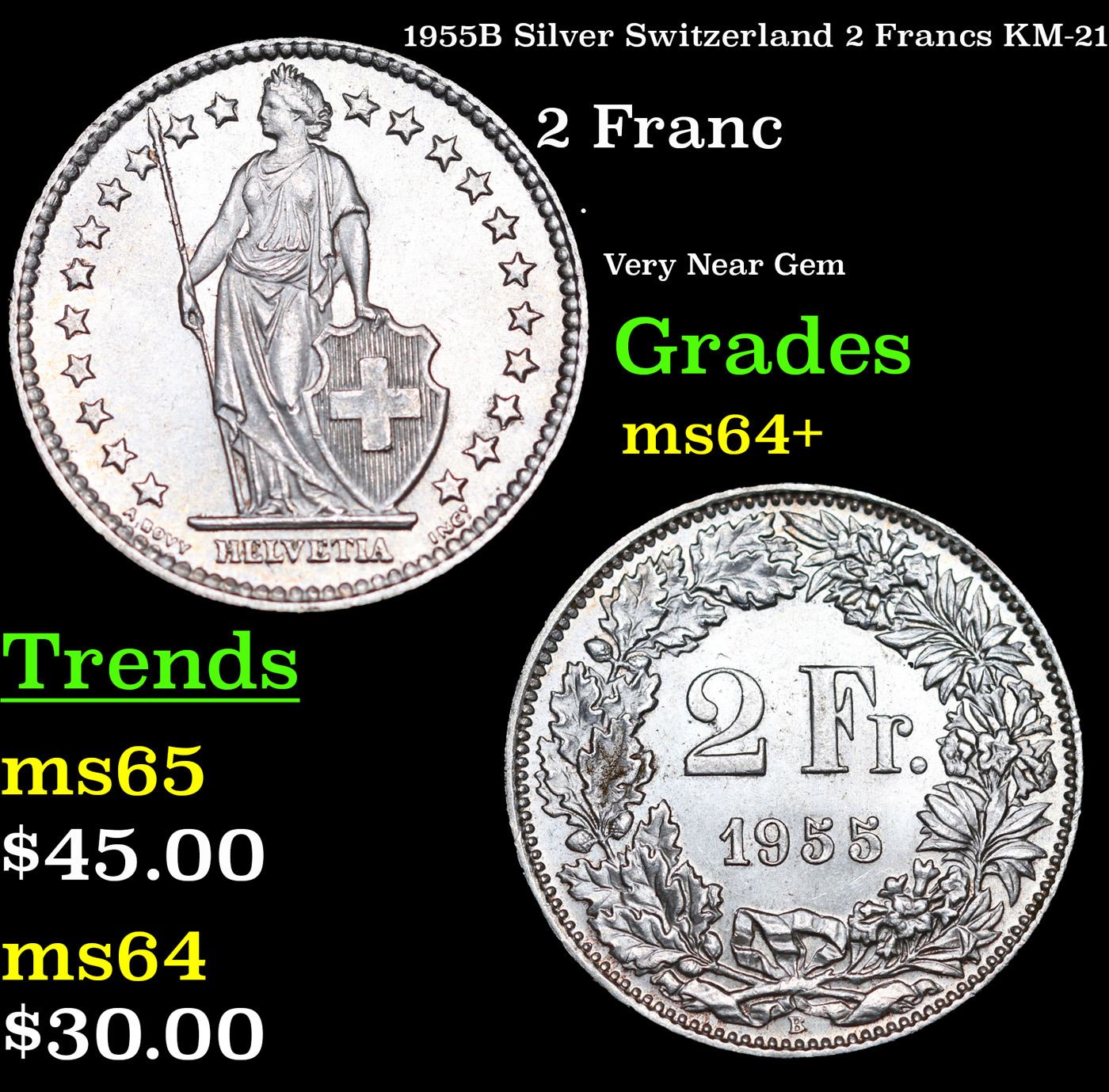 1955B Silver Switzerland 2 Francs KM-21 Grades Choice+ Unc.
