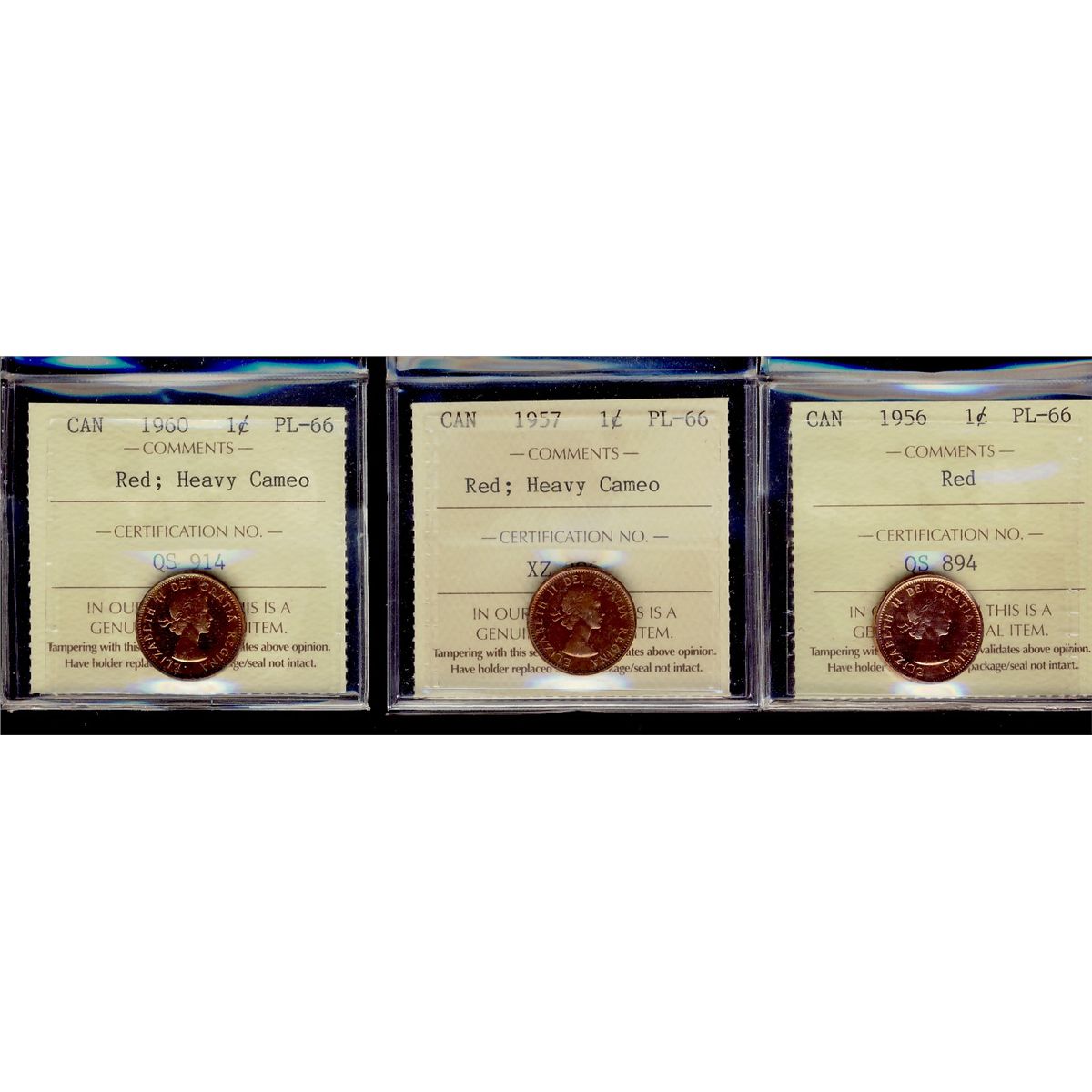 1956 1¢, 1957 & 1960 ICCS PL66RD. Lot of 3 coins with the latter two designated Heavy Cameo.