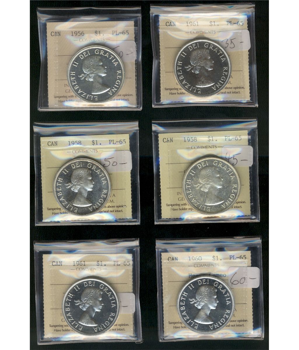 1956 $1, 1958(2), 1960 & 1961(2) ICCS PL65. Lot of 6 coins with some Cameo to Hvy Cam issues.