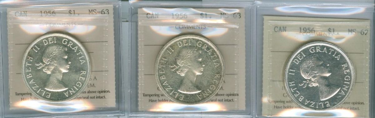 1956 $1. Lot of three coins ICCS MS62 and MS63 (2).