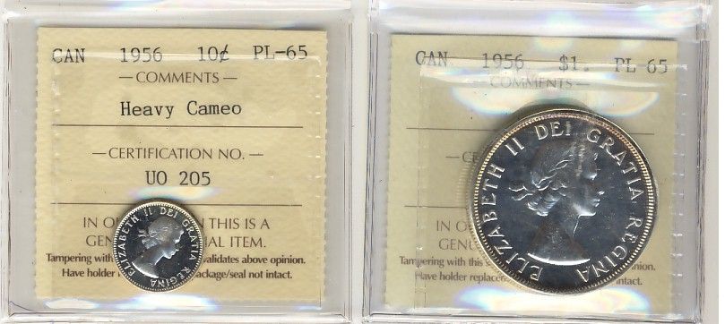 1956 $1 PL65 & 10¢ Hvy Cameo both ICCS PL65. Lot of 2 coins.