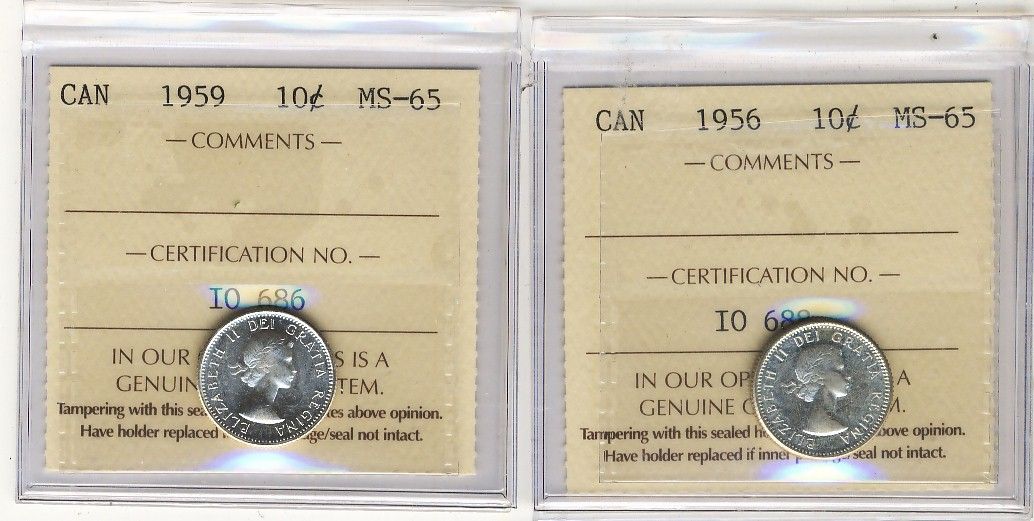 1956 10¢ & 1959 ICCS MS65. Lot of 2 coins.