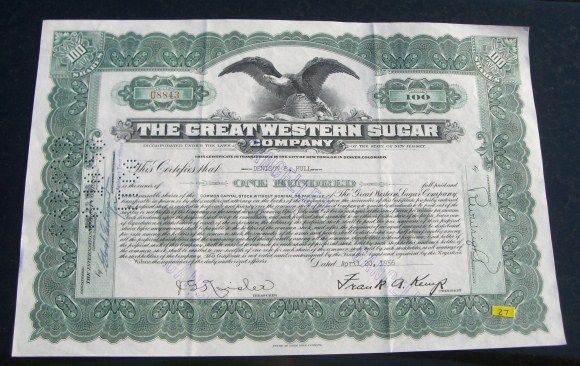 1956 100 SHARES STOCK CERTIFICATE *THE GREAT WESTERN SUGAR COMPANY - NICE STOCK CERTIFICATE*!! ***Coin, Currency & All Items Listed in this auction - Grades, Conditions and Values are not Safe Deposit Coins LLC Responsibilty. Grades, Condition and Values are determined by Consigner(s) & Buyers ONLY