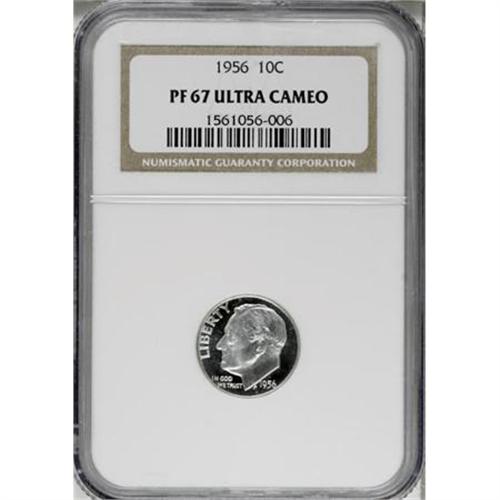 <B>1956 10C PR67 Deep Cameo NGC.</B></I> NGC Census: (18/37). PCGS Population (27/21). Numismedia Wsl. Price for NGC/PCGS coin in PR67: $220. (#95231)<BR><BR><b>Shipping:</b> Coins & Currency (<a target="_blank" href="http://www.heritageauctions.com/common/shipping.php">view shipping information</a>)