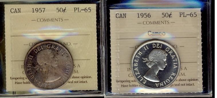 1956 & 1957 50¢ ICCS PL65. Lot of 2 coins with the 1956 showing Cameo designation