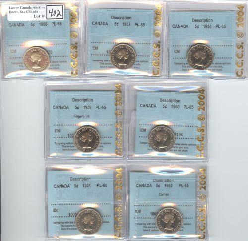7 Certified 5 Cent PL-65, dated 1956, 1957, 1958, all no cameo, 1959 no cameo & fingerprint, 1960, 1961, both no cameo, and 1962 cameo.