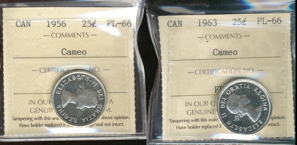 1956, 1963 ,25¢ ICCS PL66 Cameo Lot of 2 coins
