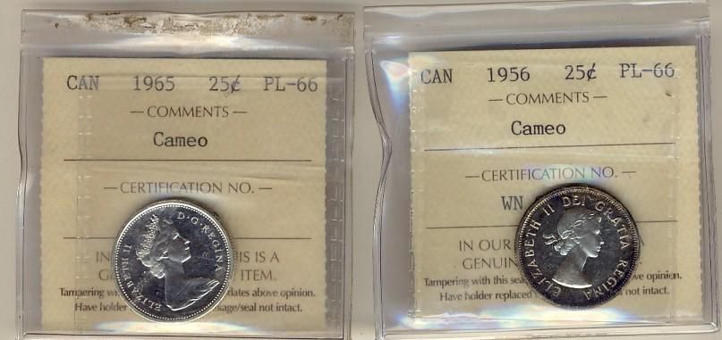 1956 & 1965 25¢ ICCS PL66 Cameo. Lot of 2 coins.
