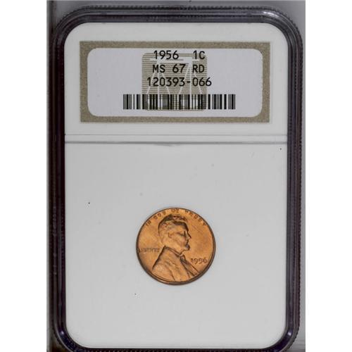 <B>1956<1C> MS67 Red NGC.</B></I> Seamless pumpkin-gold luster bathes this crisply struck and splendidly preserved Superb Gem. Many rolls of 1956 cents were set aside, but 50 years has spotted or subdued nearly all survivors. Census: 16 in 67 Red, 0 finer (7/06).<BR><I>From The Tigard Oregon Small Cent Collection.</B></I>