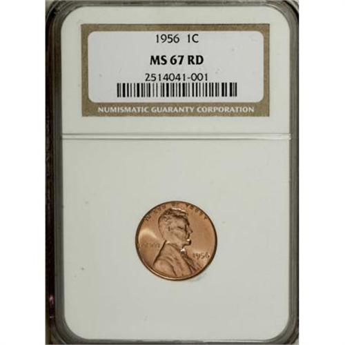 <B>1956 1C MS67 Red NGC.</B></I> The fresh copper-orange surfaces of this Superb Gem show faint blushes of rose on either side of the portrait and minimal carbon on the wheat-ears reverse. A well-defined representative that presents beautifully. Neither NGC nor PCGS has graded a numerically finer Red example (8/07).<BR><BR><B>Coin Engraver:</B> Victor D. Brenner<BR><BR><b>Shipping:</b> Coins & Currency (<a target="_blank" href="http://www.heritageauctions.com/common/shipping.php">view shipping information</a>)