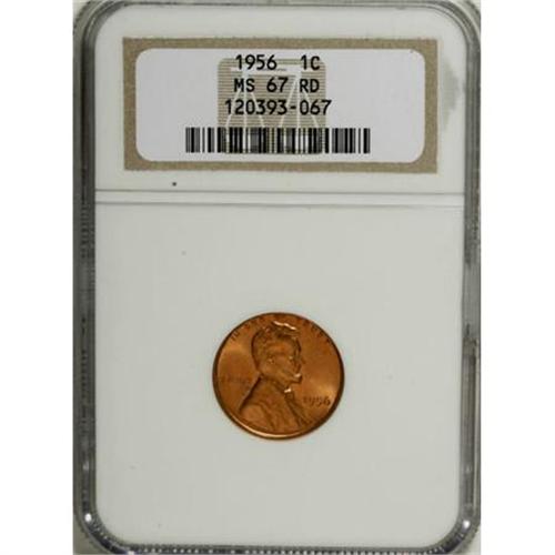 <B>1956 1C MS67 Red NGC.</B></I> Amazing full red color and marvelous mint bloom. Magnification shows only the tiniest of carbon flecks on this Superb Gem, which hails from a surprisingly challenging issue. Census: 17 in 67 Red, 0 finer (10/07).<BR><BR><B>Coin Engraver:</B> Victor D. Brenner<BR><BR><b>Shipping:</b> Coins & Currency (<a target="_blank" href="http://www.heritageauctions.com/common/shipping.php">view shipping information</a>)