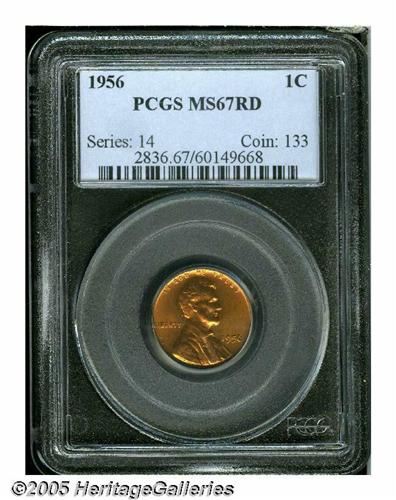 <B>1956<1C> MS67 Red PCGS.</B></I> Razor-sharp striking details and bold, bright luster are hallmarks of this supremely attractive Superb Gem. Few Lincoln cents of any date can approach this example in terms of overall technical merit and visual appeal. A few microscopic flyspecks and a couple of tiny contact marks are evident on each side of the coin, but you probably will not see any of them, unless you use a magnifier of some sort. A great example of the type. Population: 10 in 67 Red, 0 finer at either service (6/05).<BR><I>From The William Bickel Collection, Part One.</B></I>