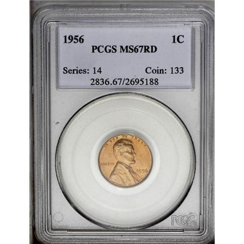 <B>1956<1C> MS67 Red PCGS.</B></I> Rich orange-red surfaces are boldly detailed and, save for a few small flecks of carbon on the obverse, virtually distraction-free. Population: 10 in 67, 0 finer (3/06). <BR><BR><B>Important notice:</B> Heritage usually auctions material at the rate of 200-250 lots per hour. On some occasions eBay Live bid software or the Internet may not be able to keep up with the pace of the auction. We recommend placing a realistic absentee bid now as insurance to avoid disappointment. Occasionally the auctioneer may eliminate or reject an eBay Live bid, and the auctioneer may also reopen a lot after the close of the eBay live bidding (usually because we missed an audience bid), and may reject your bid even if it shows you as the winning bidder. By bidding via eBay Live, you agree that Heritage may award the lot to another bidder at its sole discretion under the circumstances described above or any other reasonable circumstances. Since eBay bids are not shown to us until we open the lot on the floor, we treat those bids just like floor bids. In most cases the floor responds before the eBay bid is presented to us, due to Internet lag time, so for consistency we have made it a policy that floor bids are always considered first over tie eBay live bids. Also please note that all Heritage lots purchased through eBay Live carry a 20% Buyer's Premium. Please make sure you read the Terms and Conditions before you bid. This lot is being auctioned in conjunction with a live floor auction by Heritage Galleries & Auctioneers. All final auction and invoice information will be supplied by Heritage Galleries & Auctioneers, and all other information should be considered preliminary. Lot:681 <BR><BR><B>Winning Notification and Billing:</B> After the FINAL session in this auction is complete, Heritage will send e-mail and snail mail invoices. This process normally takes several days. All final auction and invoice information will be supplied by Heritage Galleries & Auctioneers, and all other information should be considered preliminary. <BR><BR>This auction will be conducted on a live auction floor and over the Internet through eBay Live. If you choose to place an absentee bid, please take a moment to <font color='#0000ff'><u><a href='http://pages.ebay.com/liveauctions/help/before/laabsentee.html'>learn how eBay Live absentee bidding works</a></u></font><font color='#000000'>