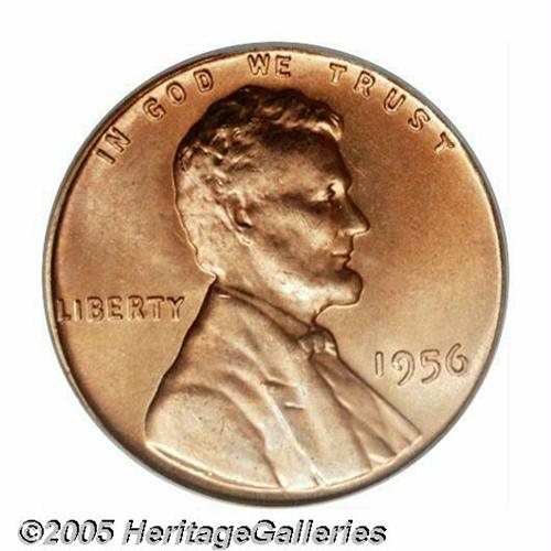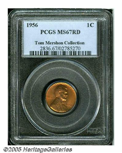 <B>1956<1C> MS67 Red PCGS.</B></I> Well struck with beautiful mint red color and bright, fulsome luster. There are a handful of flyspecks that reside on the reverse, but these are too small to really detract from the overall eye appeal of this great Superb Gem. Population: 10 in 67, 0 finer (3/05).<BR><I>From The Tom Mershon #2 All-Time PCGS Registry Set of Lincoln Wheat Cents.</B></I>