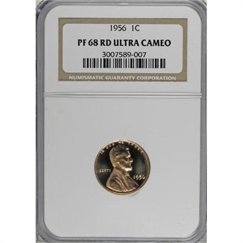 <B>1956 1C PR68 Red Ultra Cameo NGC.</B></I> An essentially perfect specimen from the year of Elvis Presley's television debut. Devoid of carbon and exactingly struck. Census: 4 in 68 Red Ultra Cameo, 2 finer (8/07).<BR><BR><b>Shipping:</b> Coins & Currency (<a target="_blank" href="http://www.heritageauctions.com/common/shipping.php">view shipping information</a>)