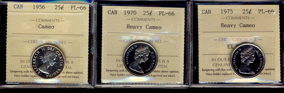 1956 25¢, 1970 & 1975 ICCS PL66. Lot of 3 coins with designations of Cameo to Heavy Cameo.
