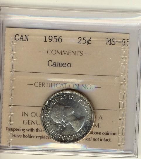 1956 25¢ ICCS MS65 CAMEO, light blue and green tones around the rims. Lustrous.