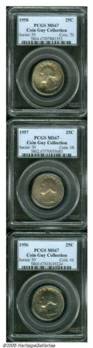 <B>1956<25C> MS67 PCGS,</B></I> awash in sea-green and peach colors, no noticeable marks; <B>1957 MS67 PCGS,</B></I> blended orange, mauve, and olive patina; and a <B>1958 MS67 PCGS,</B></I> intensely variegated golden-brown, sky-blue, and forest-green toning, well struck and lustrous. All three pieces are from the Coin Guy Collection, per the PCGS inserts.<BR><I>From The Gary Kramer Collection of Washington Quarters.</B></I>