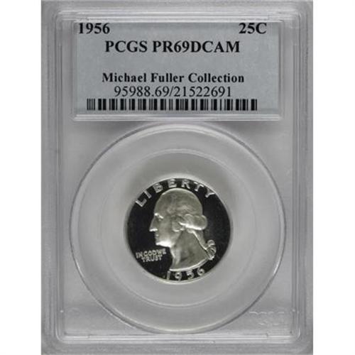 <B>1956 25C PR69 Deep Cameo PCGS.</B></I> Spectacular frost on the devices and watery fields combined for the amazing contrast on this enticing silver Washington quarter proof. PCGS has graded no PR70 pieces with Deep Cameo contrast (10/07).<BR><I>From The Michael Fuller Collection.</B></I><BR><BR><b>Shipping:</b> Coins & Currency (<a target="_blank" href="http://www.heritageauctions.com/common/shipping.php">view shipping information</a>)