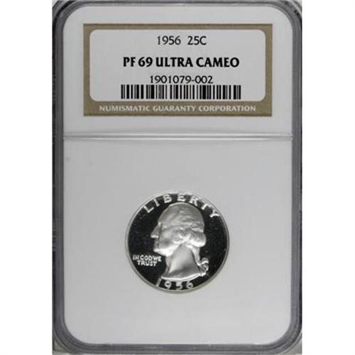 <B>1956 25C PR69 Ultra Cameo NGC.</B></I> This blast-white piece from the early era of modern cameo coinage offers fathomless fields and richly frosted devices. Amazing quality with only the tiniest of flaws visible under magnification. Census: 37 in 69 Ultra Cameo, 0 finer (8/07).<BR><BR><b>Shipping:</b> Coins & Currency (<a target="_blank" href="http://www.heritageauctions.com/common/shipping.php">view shipping information</a>)