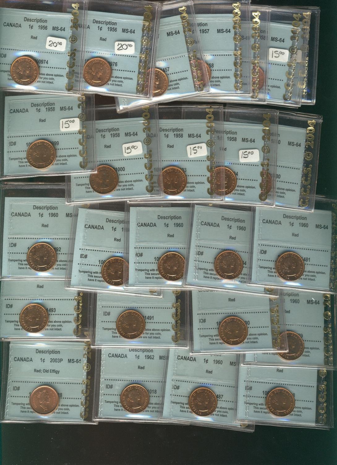 1956(3), 1957(3), 1958(6), 1960(12), 1962 & 2003P 1¢ MS64RD.  Lot of 26 pcs all CCCS graded.