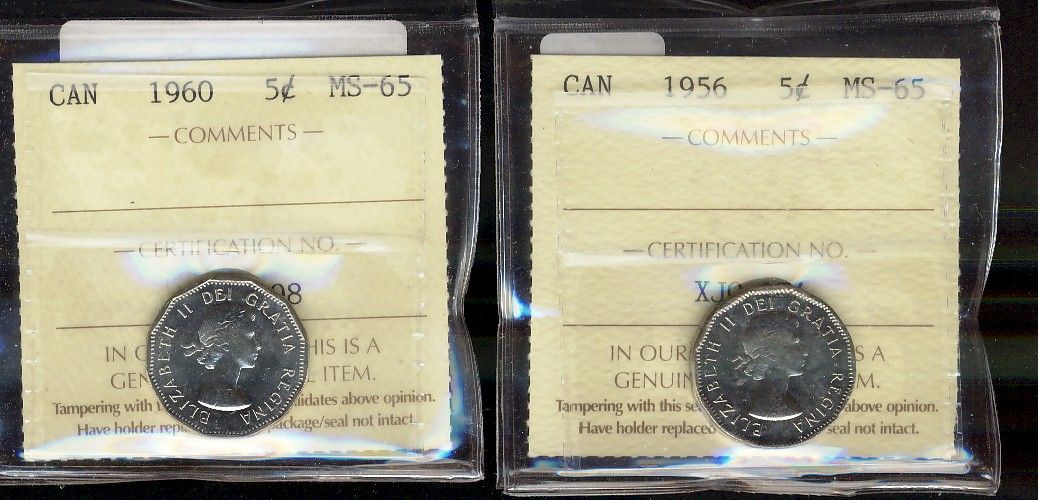 1956 5¢ & 1960 ICCS MS65. Lot of 2 coins.