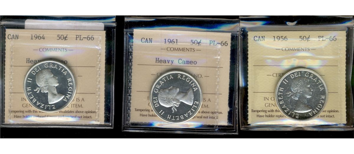 1956 50¢, 1961 & 1964 ICCS PL66. Lot of 3 coins with 1961/1966 designated Heavy Cameo.