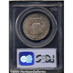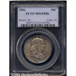<B>1956<50C> MS65 Full Bell Lines PCGS.</B></I> Toned in speckled and streaky patterns, this clean Gem showcases amber, maroon, olive, and forest-green patination. <BR><BR><B>Important notice:</B> Heritage usually auctions material at the rate of 200-250 lots per hour. On some occasions eBay Live bid software or the Internet may not be able to keep up with the pace of the auction. We recommend placing a realistic absentee bid now as insurance to avoid disappointment. Occasionally the auctioneer may eliminate or reject an eBay Live bid, and the auctioneer may also reopen a lot after the close of the eBay live bidding (usually because we missed an audience bid), and may reject your bid even if it shows you as the winning bidder. By bidding via eBay Live, you agree that Heritage may award the lot to another bidder at its sole discretion under the circumstances described above or any other reasonable circumstances. Since eBay bids are not shown to us until we open the lot on the floor, we treat those bids just like floor bids. In most cases the floor responds before the eBay bid is presented to us, due to Internet lag time, so for consistency we have made it a policy that floor bids are always considered first over tie eBay live bids. Also please note that all Heritage lots purchased through eBay Live carry a 20% Buyer's Premium. Please make sure you read the Terms and Conditions before you bid. </span></font></tr></table></td></tr></table>