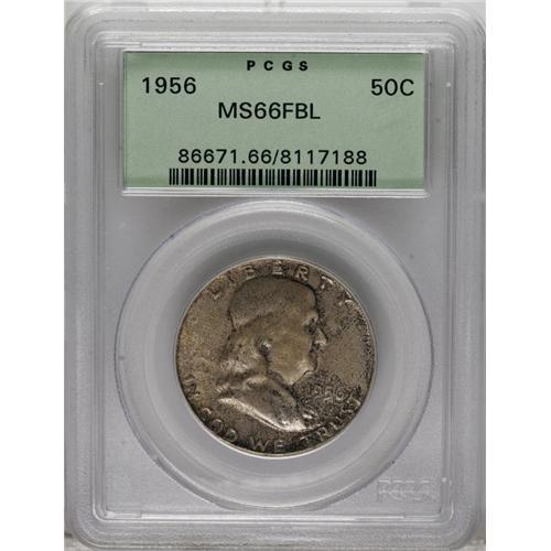 <B>1956 50C MS66 Full Bell Lines PCGS.</B></I> Mottled autumn-brown, peach, and sky-gray dominate this shimmering and sharply struck Premium Gem. An outstanding example of this relatively low mintage date. Encapsulated in a green label holder.<BR><BR><b>Shipping:</b> Coins & Currency (<a target="_blank" href="http://www.heritageauctions.com/common/shipping.php">view shipping information</a>)