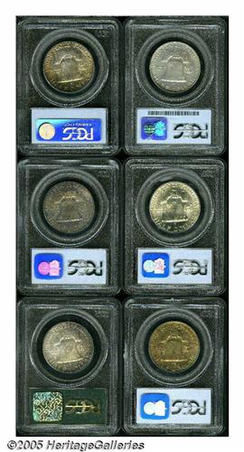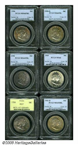 <B>1956<50C> MS66 Full Bell Lines PCGS,</B></I> lustrous with burnt orange surfaces and an excellent strike; <B>1958 MS66 Full Bell Lines PCGS,</B></I> vibrant indigo and violet color, nice strike, and good eye appeal; <B>1958 MS67 PCGS,</B></I> mottled violet, blue and yellow, superlative surfaces; <B>1958-D MS66 Full Bell Lines,</B></I> variegated green, yellow and red color, red struck, and a lustrous reverse; <B>1960 MS66 PCGS,</B></I> bright lustrous surfaces with only a couple of tiny luster marks; <B>1960-D MS65 Full Bell Lines PCGS,</B></I> deep, rich golden patina, good strike, and nice eye appeal.<BR><I>From The Southern Collection.</B></I>