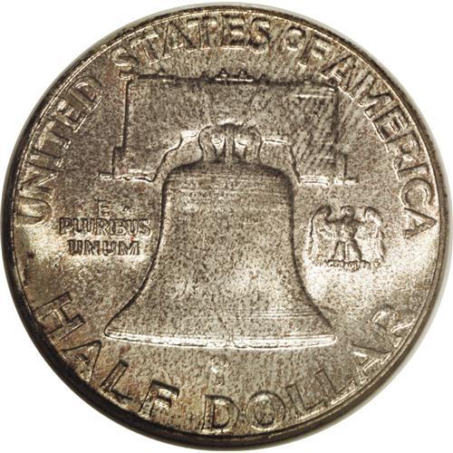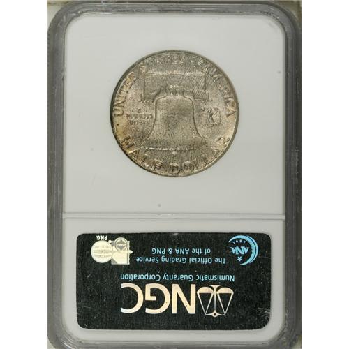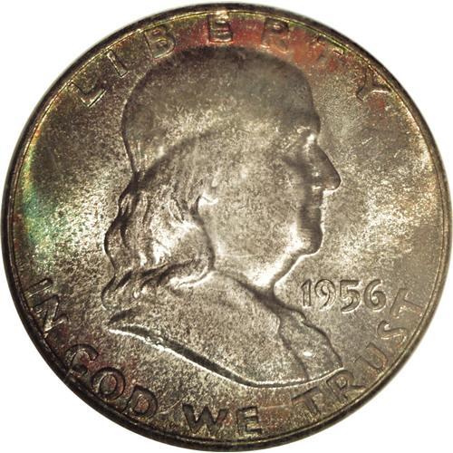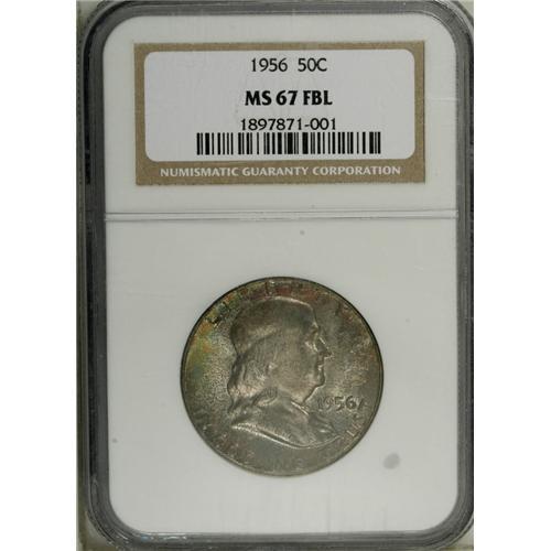 <B>1956 50C MS67 Full Bell Lines NGC.</B></I> Magnificently toned in sea-green, fire-red, gold, and cream-gray colors, this beautiful Superb Gem features potent luster and spectacularly unabraded surfaces. The strike is also superior, aside from a hint of softer definition on the tops of the letters near the rims. The quality of this outstanding piece must be seen in person to be fully appreciated. Census: 2 in 67, 0 finer (12/06).<BR><BR><b>Shipping:</b> Coin/Currency (<a target="_blank" href="http://www.heritageauctions.com/common/shipping.php">view shipping information</a>)