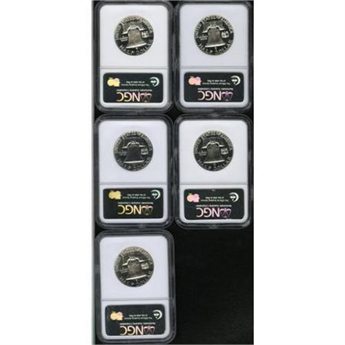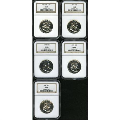 <B>1956 50C Type One PR67 NGC; 1957 PR68 NGC; 1958 PR68 NGC; 1959 PR68 NGC</B></I> and a <B>1960 PR67 NGC.</B></I><BR><BR><B>Coin Engraver:</B> John R. Sinnock<BR><BR><b>Shipping:</b> Coin/Currency (<a target="_blank" href="http://www.heritageauctions.com/common/shipping.php">view shipping information</a>\)