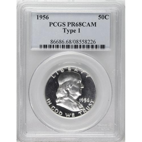 <B>1956 50C Type One PR68 Cameo PCGS.</B></I> The rarer Type One reverse is most easily distinguished by the four stubby feather tips to the left of the eagle's perch, while the far more common Type Two coin has better relief and shows three feather tips. An issue that is seldom found with cameo contrast, here on a blazing, pristine silver-white example. Population: 16 in 68, 0 finer (12/06).<BR><BR><b>Shipping:</b> Coin/Currency (<a target="_blank" href="http://www.heritageauctions.com/common/shipping.php">view shipping information</a>)