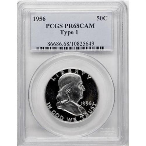 <B>1956 50C Type One PR68 Cameo PCGS.</B></I> Breen (1988) estimates only 5% of the 1956 proofs have a Type One reverse, best identified by the presence of four feather tips left of the eagle's perch. This Superb Gem is also noteworthy for its reverse, which exhibits uncommon white-on-black contrast for its ear. A flawless and essentially brilliant specimen. Population: 20 in 68 Cameo, 0 finer (10/07).<BR><I>From The Kallenberg #1 PCGS Registry Set Of Proof Half Dollars.</B></I><BR><BR><b>Shipping:</b> Coins & Currency (<a target="_blank" href="http://www.heritageauctions.com/common/shipping.php">view shipping information</a>)