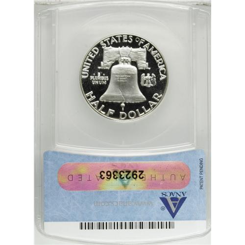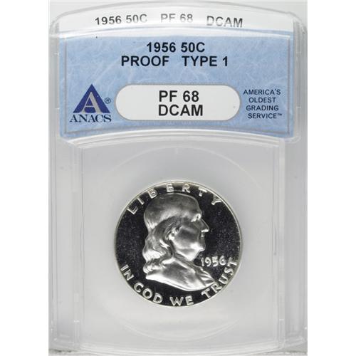 <B>1956 50C Type One PR68 Deep Cameo ANACS.</B></I> The 1956 is the first proof Franklin half for which a significant number of Cameo examples exist. The contrast is distinct and strong on this immensely appealing Superb Gem, which sports fathomless fields and boldly detailed devices. A tiny contact mark on the richly frosted bell is the only perceptible flaw.<BR><BR><b>Shipping:</b> Coin/Currency (<a target="_blank" href="http://www.heritageauctions.com/common/shipping.php">view shipping information</a>)