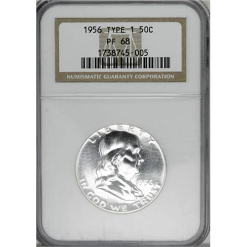 <B>1956 50C Type One PR68 NGC.</B></I> NGC Census: (0/0). PCGS Population (56/1). Numismedia Wsl. Price for NGC/PCGS coin in PR68: $242. (#6686)<BR><BR><B>Coin Engraver:</B> John R. Sinnock<BR><BR><b>Shipping:</b> Coins & Currency (<a target="_blank" href="http://www.heritageauctions.com/common/shipping.php">view shipping information</a>)