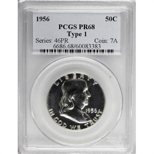 <B>1956 50C Type One PR68 PCGS.</B></I> PCGS Population (0/0). NGC Census: (0/0). Numismedia Wsl. Price for NGC/PCGS coin in PR68: $242. (#6686)<BR><BR><B>Coin Engraver:</B> John R. Sinnock<BR><BR><b>Shipping:</b> Coins & Currency (<a target="_blank" href="http://www.heritageauctions.com/common/shipping.php">view shipping information</a>\)