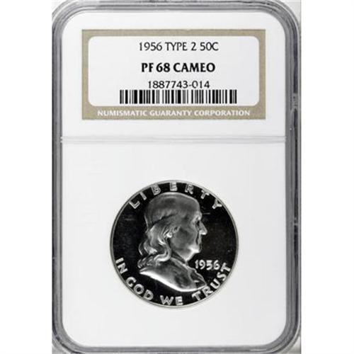 <B>1956 50C Type Two PR68 Cameo NGC.</B></I> NGC Census: (1032/77). PCGS Population (512/29). Numismedia Wsl. Price for NGC/PCGS coin in PR68: $150. (#86697)<BR><BR><b>Shipping:</b> Coins & Currency (<a target="_blank" href="http://www.heritageauctions.com/common/shipping.php">view shipping information</a>)