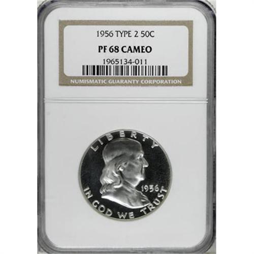 <B>1956 50C Type Two PR68 Cameo NGC.</B></I> . NGC Census: (1032/77). PCGS Population (512/29). Numismedia Wsl. Price for NGC/PCGS coin in PR68: $150. (#86697)<BR><BR><b>Shipping:</b> Coins & Currency (<a target="_blank" href="http://www.heritageauctions.com/common/shipping.php">view shipping information</a>)